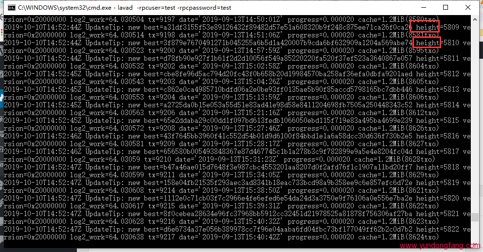 图下这个Windows在打开批处理文件的时候就会弹出来,而且会一直动。height 这个就是高度的意思,当这个数字和区块浏览器的高度一样的时候就可以开始绑定矿池了。