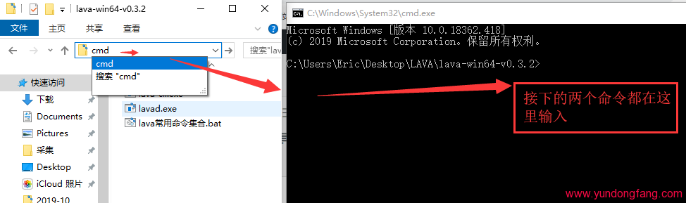 然后在节点钱包的文件地址栏上输入【CMD】回车,会弹出一个黑Windows。如下图所示: