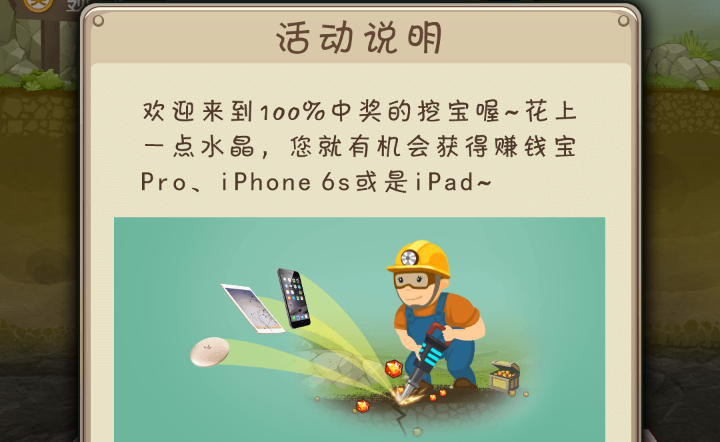 这个挖宝活动看似简单却不是一般人能干的“好事”,为什么这么说呢?你想真正获得什么大奖的话,5秒钟内你需要点按屏幕50下以上才到达到二层,这样才有 机会获得。别说小女生就比男生差,我可是拼了命一样使劲按了个70下出来,然而这跟大奖没有绝对关系,只能说我的运气还不够。